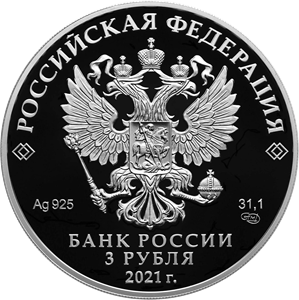 на зеркальном поле диска — рельефное изображение Государственного герба Российской Федерации, над ним вдоль канта — надпись полукругом: «РОССИЙСКАЯ ФЕДЕРАЦИЯ», обрамленная с обеих сторон сдвоенными ромбами, внизу под гербом: слева — обозначения драгоценного металла и пробы сплава, справа — содержание химически чистого металла и товарный знак монетного двора, внизу в центре в три строки — надпись: «БАНК РОССИИ», номинал монеты: «3 РУБЛЯ», год выпуска: «2021 г.».