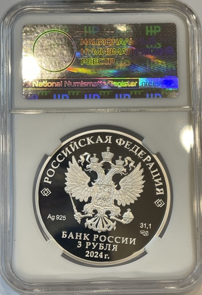 рельефное изображение Государственного герба Российской Федерации, над ним вдоль канта – надпись полукругом «РОССИЙСКАЯ ФЕДЕРАЦИЯ», обрамленная с обеих сторон сдвоенными ромбами, под гербом слева – обозначения драгоценного металла и пробы сплава, справа – содержание химически чистого металла и товарный знак монетного двора, внизу в центре в три строки – надпись «БАНК РОССИИ», номинал монеты «3 РУБЛЯ», год выпуска «2024 г.».