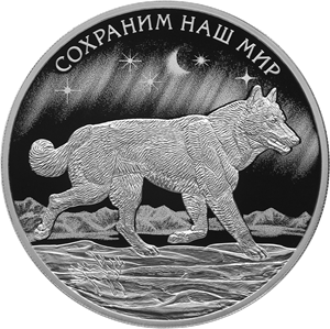 на зеркальном поле диска — рельефное изображение полярного волка на фоне изображений скал и звездного неба; вверху вдоль канта — надпись: «СОХРАНИМ НАШ МИР».