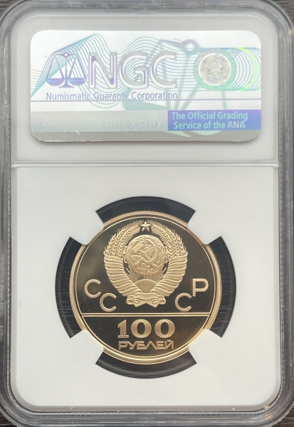 Сверху герб СССР с 15 витками ленты, слева от него буквы «СС», справа «СР», ниже двойная черта, под ней обозначение достоинства монеты цифра «100» и ниже слово «РУБЛЕЙ».
