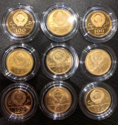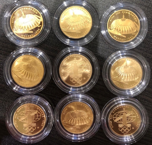 • В 1977-1980  было выпущено шесть видов олимпийских монет из золота. Номинал монеты — 100 рублей, проба 900 (Au 900), вес — 17.45 г, диаметр — 30 мм, тираж 235 тыс. шт., монетные дворы: ЛМД, ММД. На лицевой стороне монеты изображение герба, на оборотной — олимпийские сооружения. Это первая монета СССР (с гербом СССР) чеканенная из золота, после длительного перерыва — легендарного золотого червонца РСФСР 1923 года