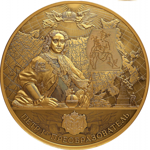 рельефные изображения портрета Петра I с императорскими регалиями, и ангелов, поддерживающих корону, на фоне карты Российской империи и стелы с аллегориями империи; справа расположено растровое изображение, представляющее собой аллегории успешной торговли и созидания, видимые поочередно при изменении угла зрения; в нижней части — рельефное изображение двуглавого орла, наложенного на горностаевую мантию, на фоне выполненной в технике лазерного матирования композиции из военной атрибутики; внизу по окружности имеется рельефная надпись: «ПЕТР I • ПРЕОБРАЗОВАТЕЛЬ».