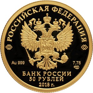 Рельефное изображение Государственного герба Российской Федерации, имеются надписи: «РОССИЙСКАЯ ФЕДЕРАЦИЯ», «БАНК РОССИИ», номинал монеты — «50 РУБЛЕЙ» и дата — «2018 г.», обозначение металла по Периодической системе элементов Д.И. Менделеева, проба, товарный знак Санкт-Петербургского монетного двора и масса драгоценного металла в чистоте.