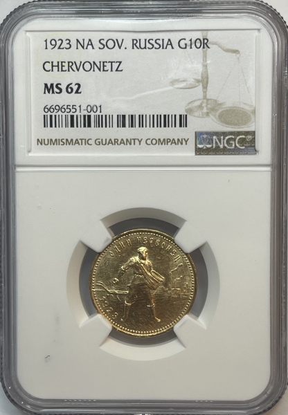 Золотая монета Червонец Сеятель 1923 г. в слабе NGC MS 62
