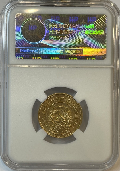 Золотая монета Червонец Сеятель 1923 г. в слабе ННР MS 62