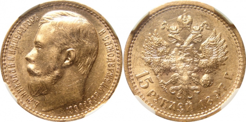 Золотые монеты 15 рублей чеканились с 1897 по 1899 год в соответствии с указом «О чеканке и выпуске в обращение золотых монет» от 3 января 1897 года, подготовленным министром финансов С. Ю. Витте. Независимо от года выпуска, на всех таких монетах обозначен 1897 год. Эти монеты имели хождение в Российской Империи наравне с бумажными деньгами, но в начале XX века постепенно стали изыматься из обращения, и до наших дней сохранилось не так уж много монет в идеальном состоянии.