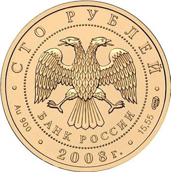в центре диска - эмблема Банка России (двуглавый орел с опущенными крыльями, под ним надпись полукругом "БАНК РОССИИ"), обрамленная кругом из точек и надписями по кругу: вверху - "СТО РУБЛЕЙ", внизу - "2008 г.", слева - обозначение металла, проба сплава, справа - содержание драгоценного металла в чистоте и товарный знак монетного двора.
