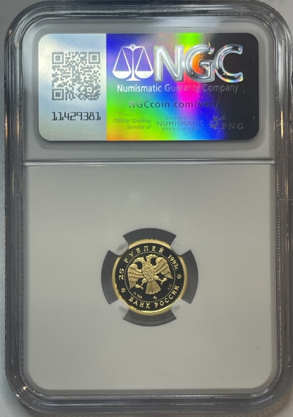 Золотая монета "Русский балет", 25 рублей, 1993 год, 3,11г., Au 999, ММД, в слабе NGC PROOF 70 ULTRA CAMEO