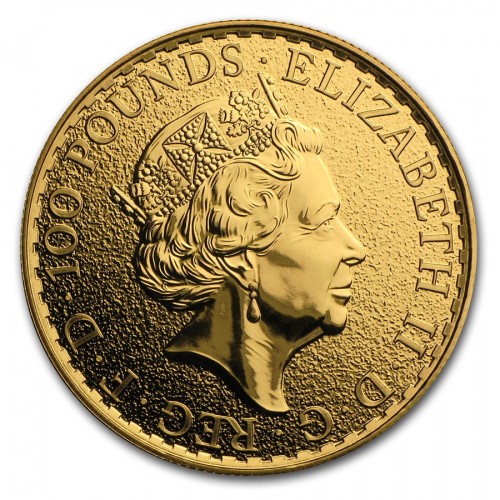 • На аверсе золотой монеты Великобритании "Год петуха" - портрет ее Величества королевы Елизаветы II (пятый вариант за всю историю). По периметру аверса монеты - надписи на английской языке, означающие номинал монеты (100 фунтов стерлингов) и имя монарха (Елизавета II).