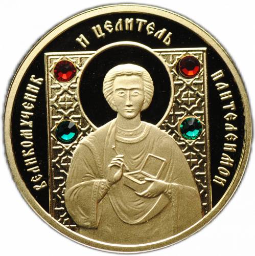 Реверс: вверху по кругу – надпись: Великомученик и целитель Пантелеймон; в центре – на фоне орнамента, применяемого в иконографии, со вставкой (четыре синтетических кристалла) – образ святого Пантелеймона.
